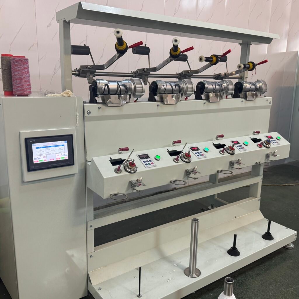 - Servo-driven traverse with PLC control for precise yarn formation.