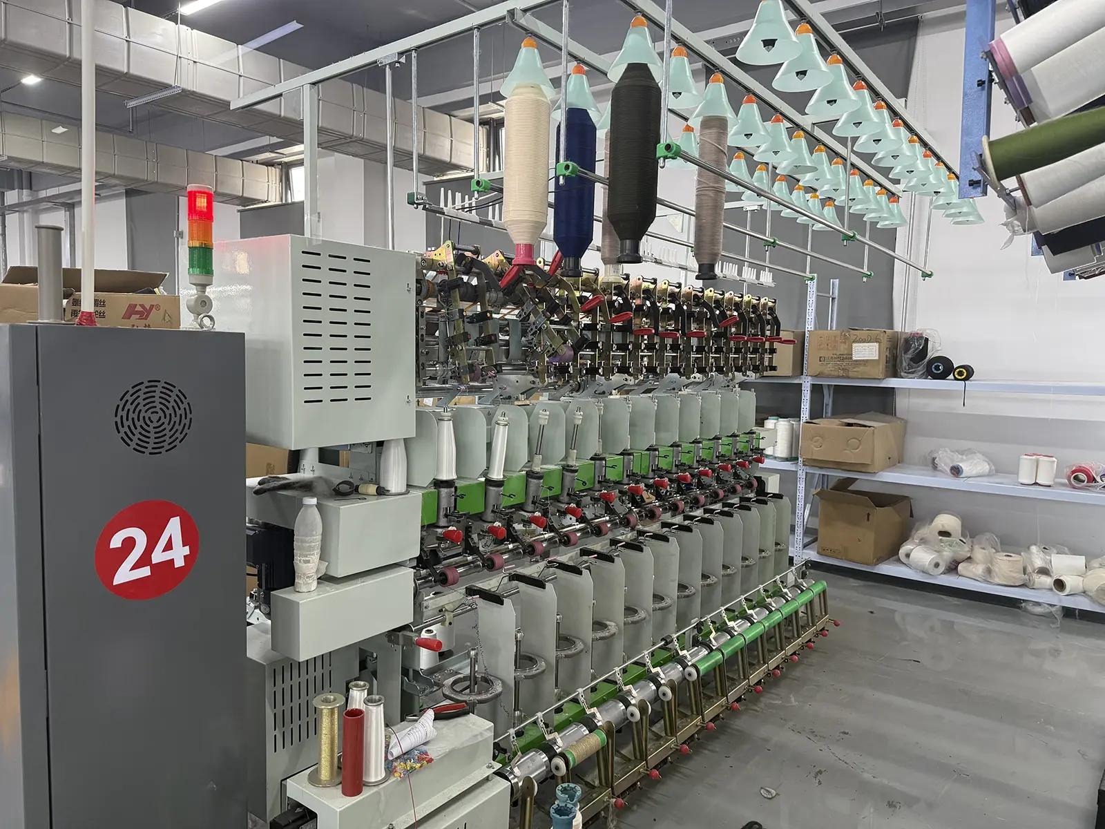 The machine adopts a three-color roving feeding system, enabling consistent and efficient production of fancy yarns. Equipped with both ring spindle and fluted tube winding options, it provides flexibility in yarn take-up methods while ensuring smooth yarn formation and high consistency. The drafting system features 6 rollers with a gantry-type frame set at a 90-degree vertical position, stabilizing fiber drafting for uniform yarn thickness. Two core yarn guide slots on the metal front rollers undergo special treatment, offering significant advantages for high-count single-core or dual-core fancy yarns. The PLC-based control system and touchscreen panel allow operators to easily adjust process parameters, store recipes, and switch production quickly.