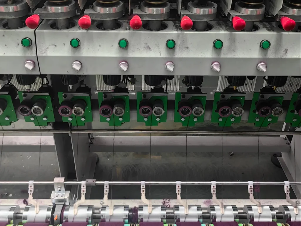 The machine adopts a single-color roving feeding system, ensuring stable and efficient fancy yarn production. Equipped with fluted tube winding and composite spindle technology, it guarantees smooth yarn formation and high consistency. Each spindle is independently servo-driven, allowing precise control of speed and tension. With a PLC-based control system and touchscreen panel, operators can easily set process parameters, store recipes, and switch production quickly to meet diverse yarn requirements.